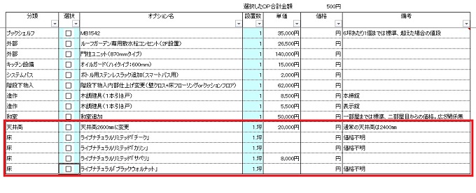営業さんに確認したところ、フローリングオプションは種類が変わっても8,000円とのことです。