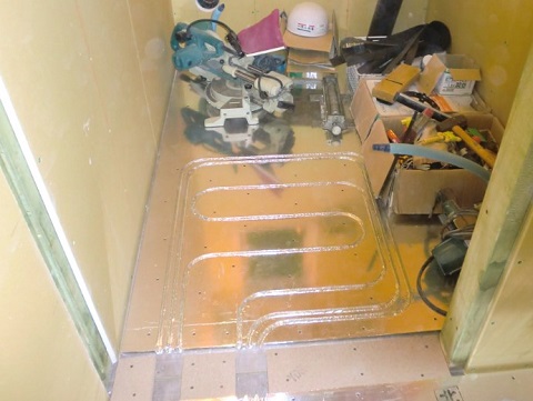 さらにPS(パイプスペース)の床暖パネルの施工、ここは工場で切り抜かれているのか、あとから大工さんが施工してくれたのかは不明です。