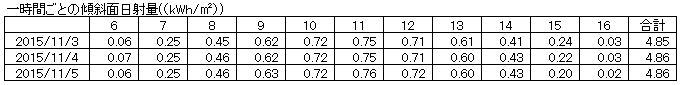 全天日射量はご覧の通り。三日間ほぼ快晴とあって、一日を通してだけではなく、一時間単位でもほとんど同じでした。