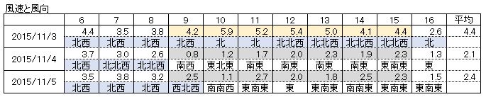 11/3は日中、北から北西の風が4~5m吹いており、他の日についてはおおむね南東方向からの2m程度の弱い風しか吹いていませんでした。