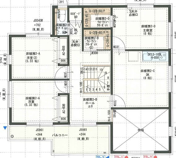 リビング上にある吹抜けを6帖から8帖にしてオープンステアを東側に持ってくると、二階の間取りはいくらでもいじることが出来そうです(^^)